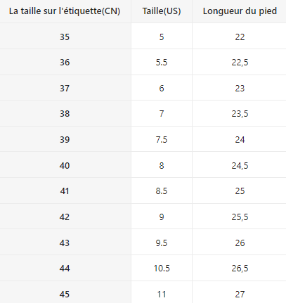 Notre équipe vous conseille de prendre votre taille habituelle de chaussures, si vous hésitez entre 2 tailles, il est avantageux de privilégier la plus grande.